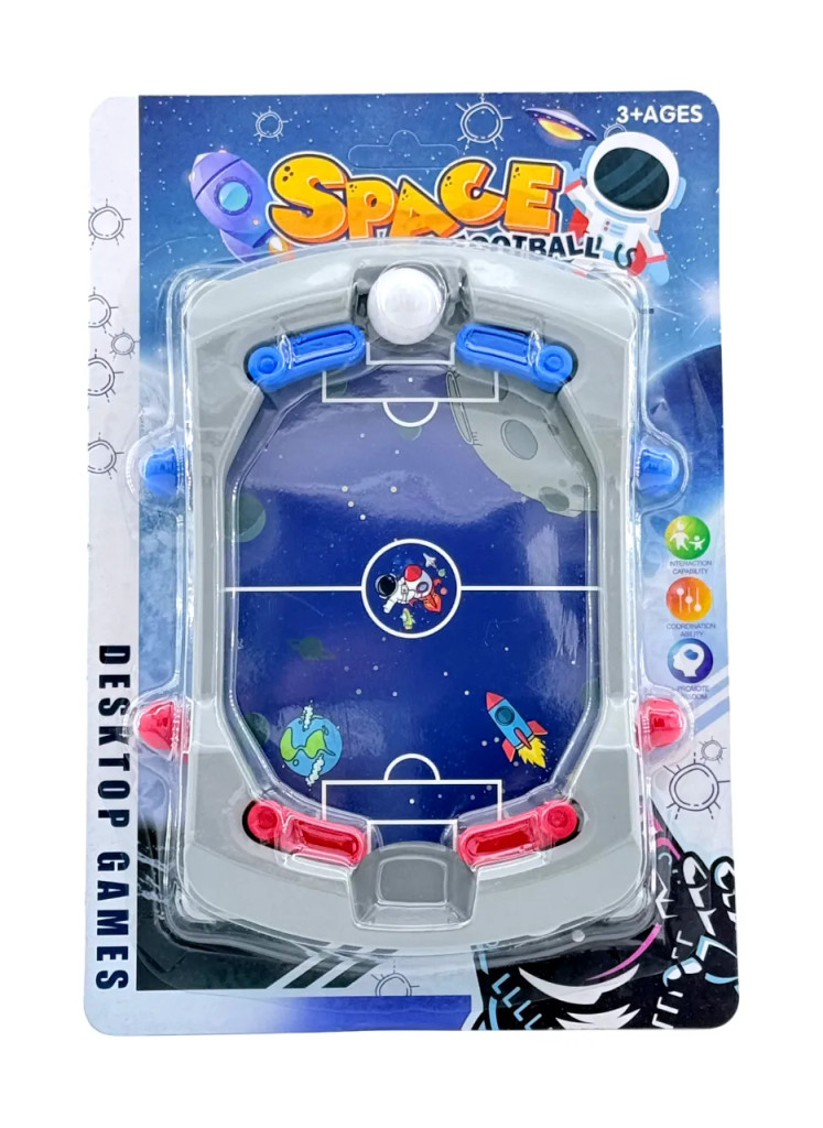 Az asztali foci minden korosztály kedvence lehet, és ez a kompakt, mégis látványos kis pálya tökéletes arra, hogy bárhol és bármikor induljon a meccs hangulata. A 14 x 18 cm méretű játéktér pont ideális ahhoz, hogy kézben tartsd az irányítást, miközben izgalmas labdameneteket kreálsz. A játék élénk űrtematikájú dizájnja vidáman dobja fel a hangulatot, így a gyerekek fantáziája azonnal szárnyra kap, mintha egy galaktikus bajnokság közepébe csöppennek.