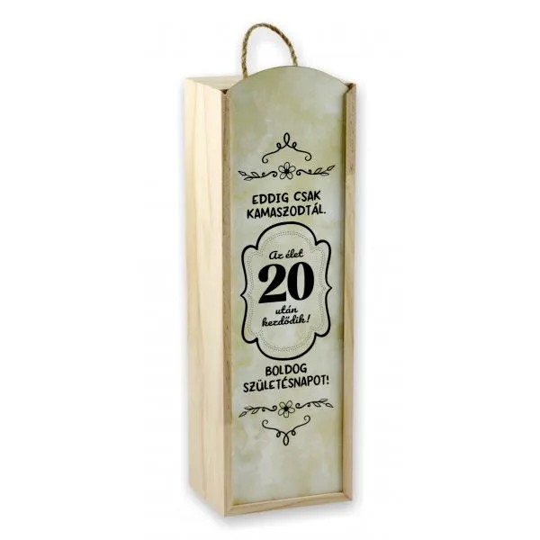 A tetején található kis kötél fogantyú megkönnyíti a szállítást, a faanyag pedig tartósságot és természetes megjelenést biztosít. Ha igazán egyedi módon szeretnéd átadni ajándékodat a 20 éves ünnepeltnek, ez a bortartó garantáltan elnyeri a tetszését.