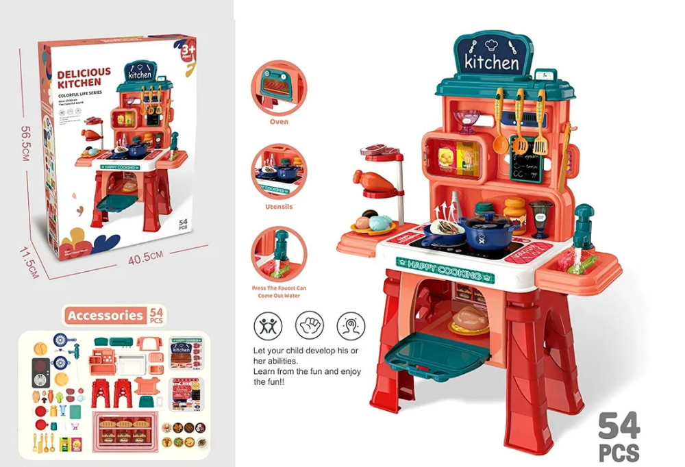 Megérkezett az álomkonyha minden kis szakács számára! Ezt a nagyméretű, összerakható konyhai asztalt úgy terveztük, hogy minél élethűbb és sokoldalúbb játékélményt kínáljon. A konyhai asztalon túl a csomag rengeteg kiegészítőt tartalmaz, hogy a kulináris kalandok sosem érjenek véget. Pucolj zöldségeket, készítsd elő a hozzávalókat és tálald fel étkeidet a mellékelt tányérokon!