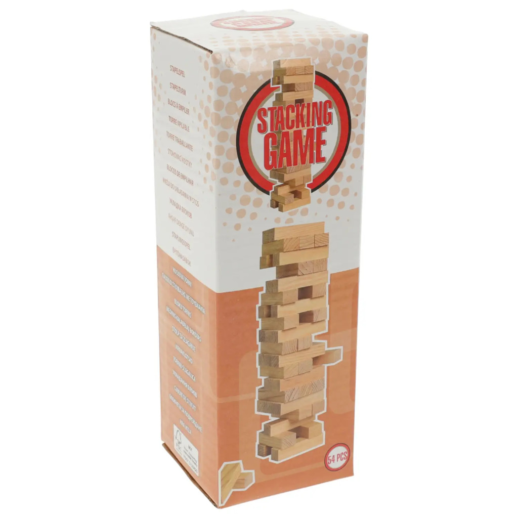 Ez az 54 darabos fa toronyépítő játék klasszikus ügyességi társasjáték, amely garantált izgalmat és nevetést hoz minden korosztály számára. A Stacking Game fa építőkocka készlet célja egyszerű: építsd fel a tornyot, majd húzz ki egy-egy elemet úgy, hogy a torony ne dőljön össze!