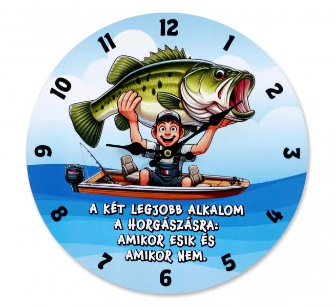 Ez a 30 cm-es horgász falióra igazi telitalálat minden horgászat szerelmese számára. A vidám, rajzolt dizájnon egy boldog pecás látható hatalmas hallal a kezében, és a humoros felirat tökéletesen összefoglalja a horgászok életérzését.
