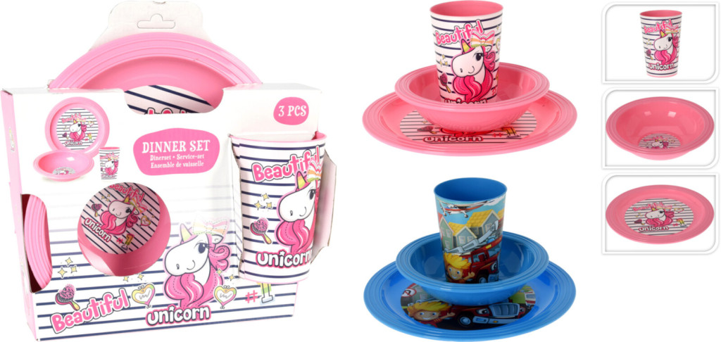 A készlet három részből áll: egy tányérból, egy tálkából és egy pohárból, így minden adott egy finom reggelihez, ebédhez vagy vacsorához. Két különböző mintában érhető el, így minden kisgyermek megtalálhatja a kedvencét. A vidám dizájn játékos hangulatot teremt az asztalnál, miközben a praktikus kialakítás a mindennapi használatot is kényelmessé teszi. A tartós műanyag anyag könnyű, mégis strapabíró, ezért jól bírja a mindennapos használatot. A sima felület könnyen tisztítható, így a szülők számára is praktikus megoldás. A készlet ideális otthoni használatra, de akár utazásokhoz vagy piknikhez is remek választás lehet.