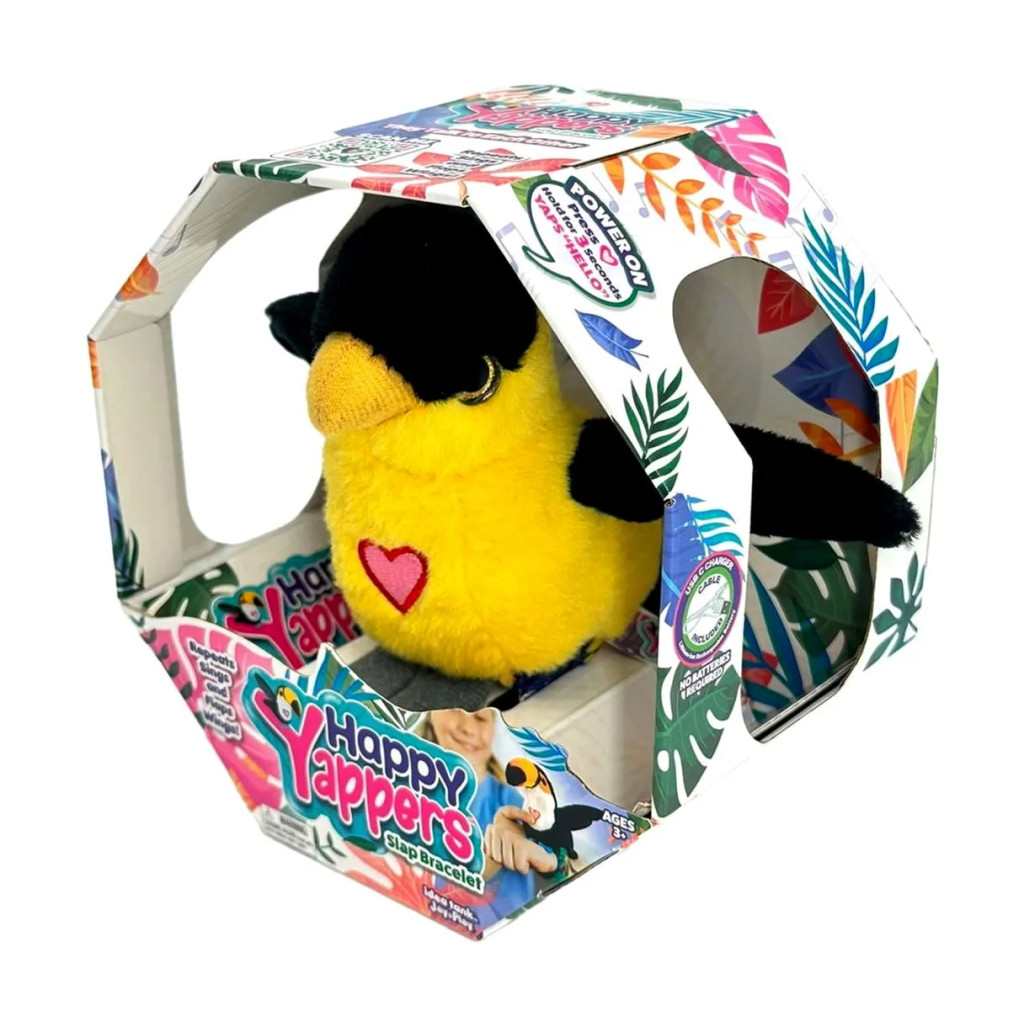 A legszínesebb madarak repkedő rajához most te is csatlakozhatsz! A Happy Yappers interaktív plüss madarakat a pánt segítségével könnyen a csuklódra ülnek. Csak nyomd meg a szívecskét a mellkasukon, és máris indulhat a közös játék! Ezek a madarak csiripelnek, énekelnek, beszélnek hozzád, és akár meg is ismétlik, amit mondasz.
