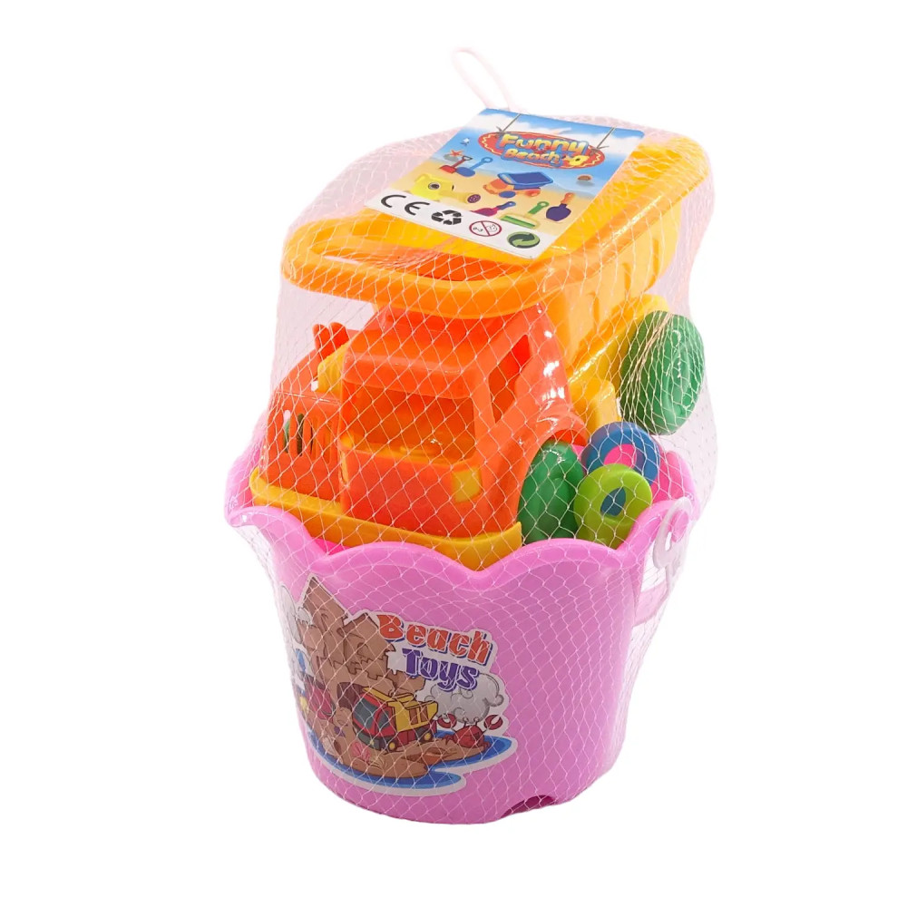A szett tartalma: 1 db lapát, 1 db gereblye, 1 db szűrő, 1 db vödör, 1 db dömper és 4 db homokozó forma.