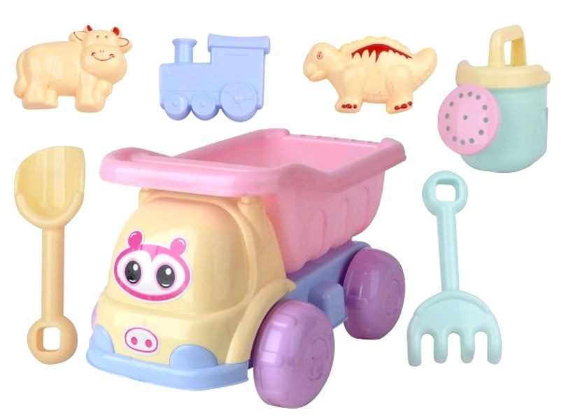 A szett tartalmaz: 1 db dömpert, 3 db homokozó formát, 1 db homokozó lapátot, 1 db locsolót és 1 db gereblyét.