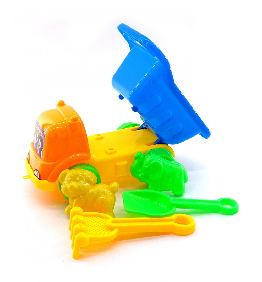 A szett tartalmaz: 1 db dömpert, 2 db homokozó formát, 1 db homokozó lapátot és 1 db gereblyét.