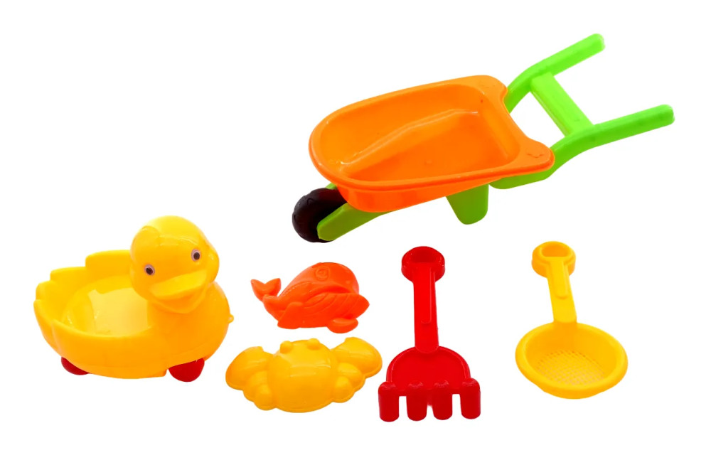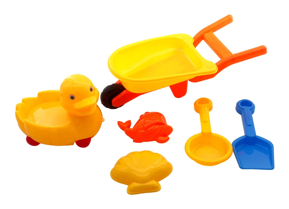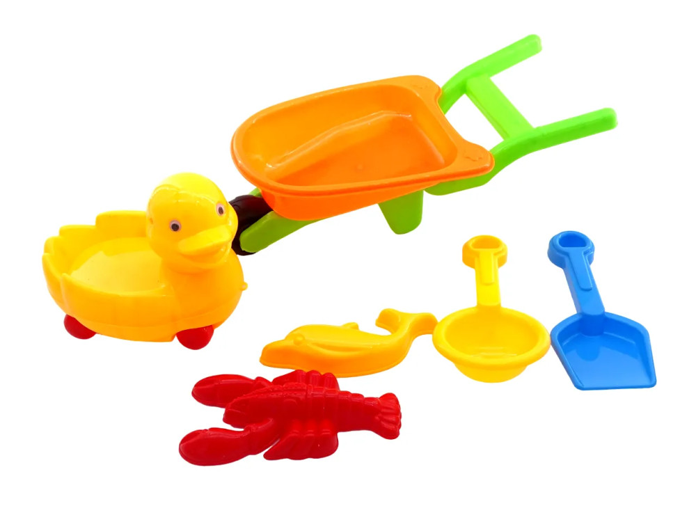 A szett tartalma: 1 db talicska, 1 db kacsa, 2 db homokozó forma, 1 db lapát és 1 db homokozó kanál.