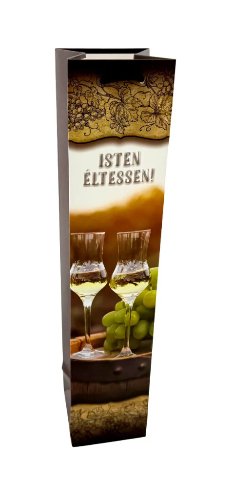 Elegáns és stílusos megoldás ajándékba szánt italok csomagolására ez a Isten éltessen! felirattal ellátott italtasak. A 8 x 38 x 8 cm-es méretének köszönhetően tökéletes választás bor, pezsgő vagy más palackozott italok átadásához.