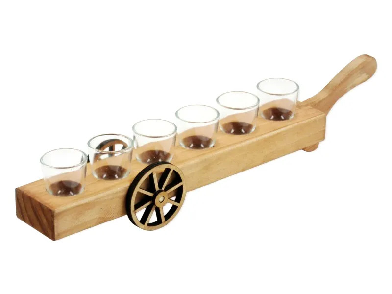 Ha igazán különleges módon szeretnéd kínálni a pálinkát, ez a 42 x 7 cm-es, kerekes kínálós pálinkás pohár szett garantáltan feldobja az asztalt. A fa kialakítás és a díszes kerék egyedi, rusztikus hangulatot ad, így nemcsak praktikus, hanem látványos kiegészítője is lesz bármilyen összejövetelnek.