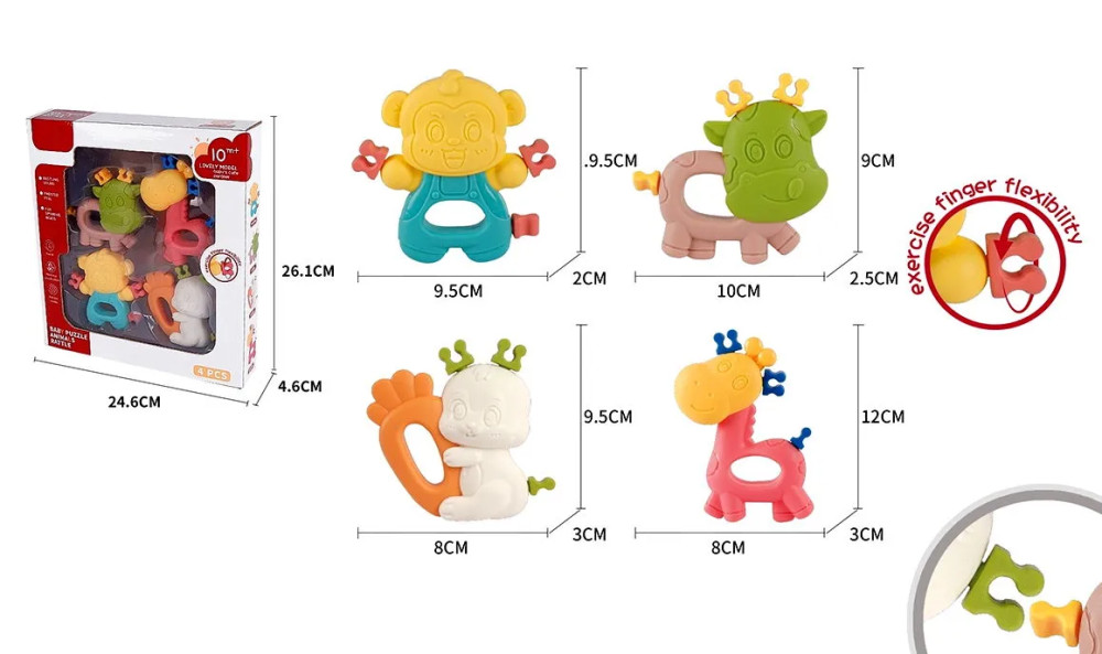 A szettben található négy csörgő különböző állatformájúak, hogy a gyerekek megismerhessék az állatok világát játékos formában. Az élénk színek és az érdekes formák felkelthetik a gyerekek érdeklődését, míg a csörgő hangok ösztönzik az auditív érzékelést.