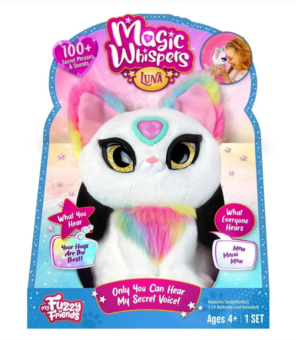 Varázslatos titkok és mókás suttogások várnak a Magic Whispers suttogó cicával! Ez a gyönyörű, szivárványszínű bundájú interaktív plüss igazi különlegesség: több mint 100 titkos mondattal és hanggal szórakoztat, ráadásul a titkait csak te hallhatod, ha közel hajolsz hozzá. A cica aranyszínű, csillogó szemei és világító szív alakú medálja még varázslatosabbá teszik a közös játékot, és olyan érzést kelt, mintha egy igazi kis varázslény lenne a szobádban.