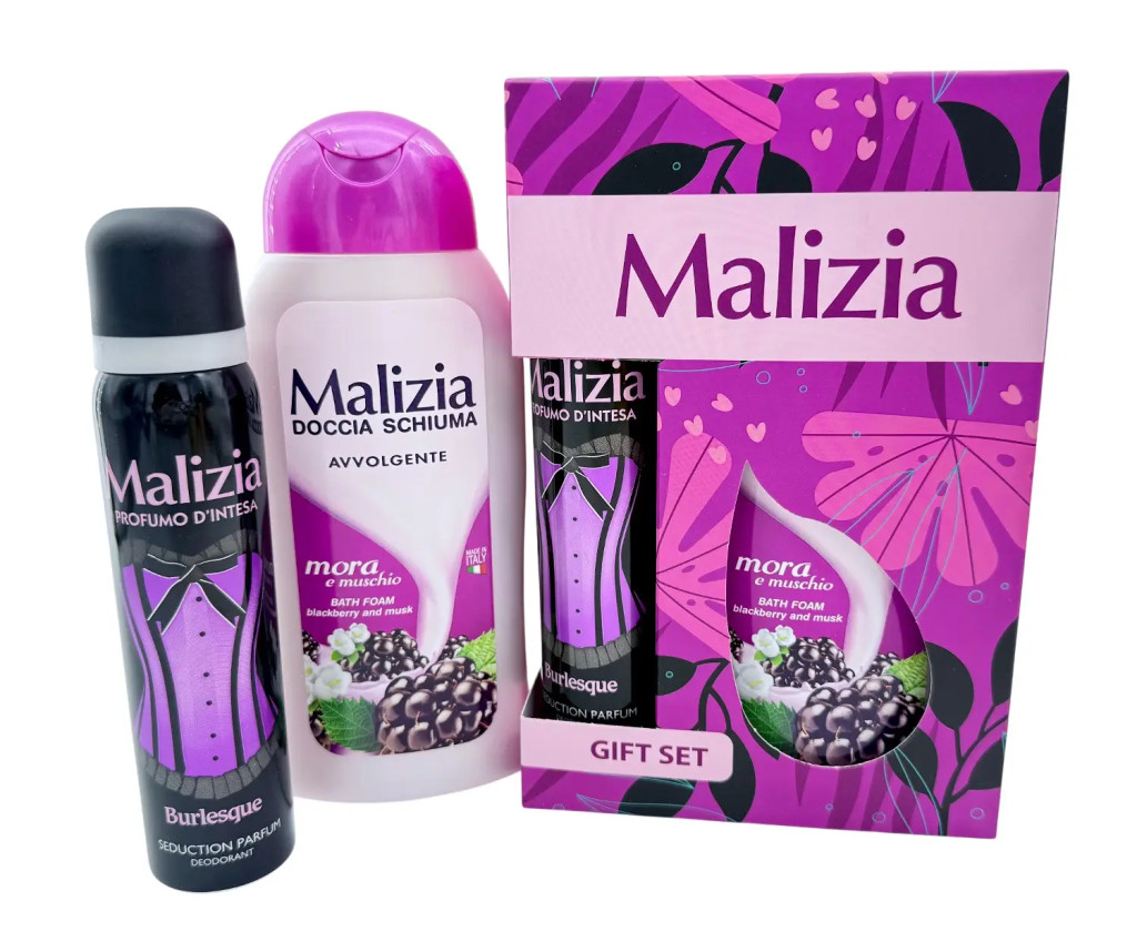 Egy ajándékcsomag, amely már a külsejével is elárulja, hogy különleges élményt tartogat. A Malizia Mora e Muschio Burlesque szett tökéletes választás mindazok számára, akik szeretik a gyümölcsösen érzéki és elegáns illatokat. A csomagban két gondosan válogatott termék található: egy tusfürdő és egy dezodor, amelyek harmonikusan egészítik ki egymást.