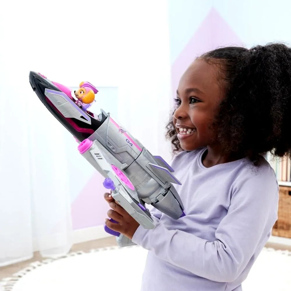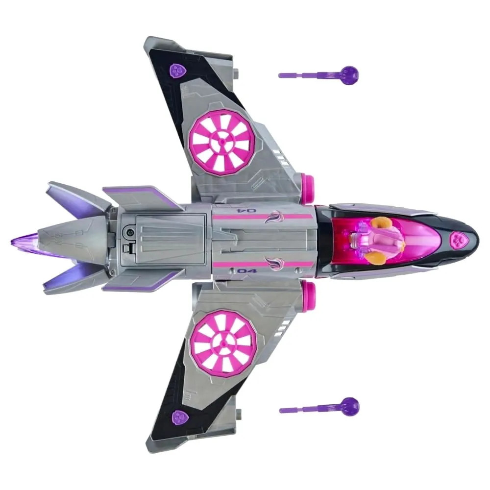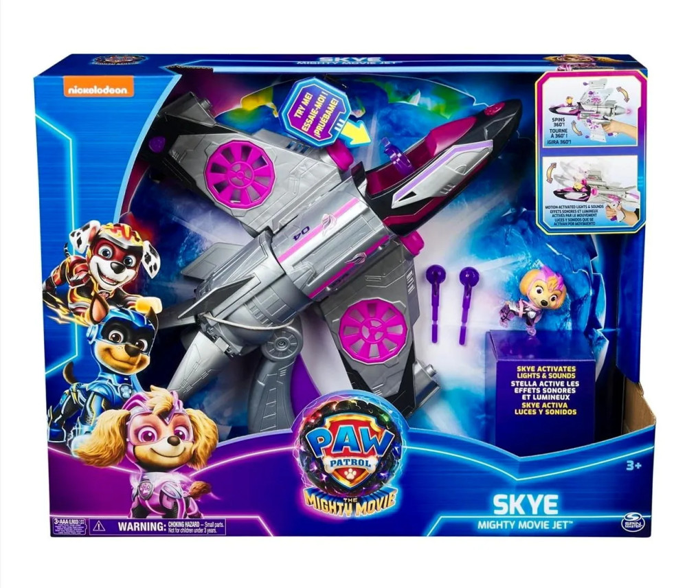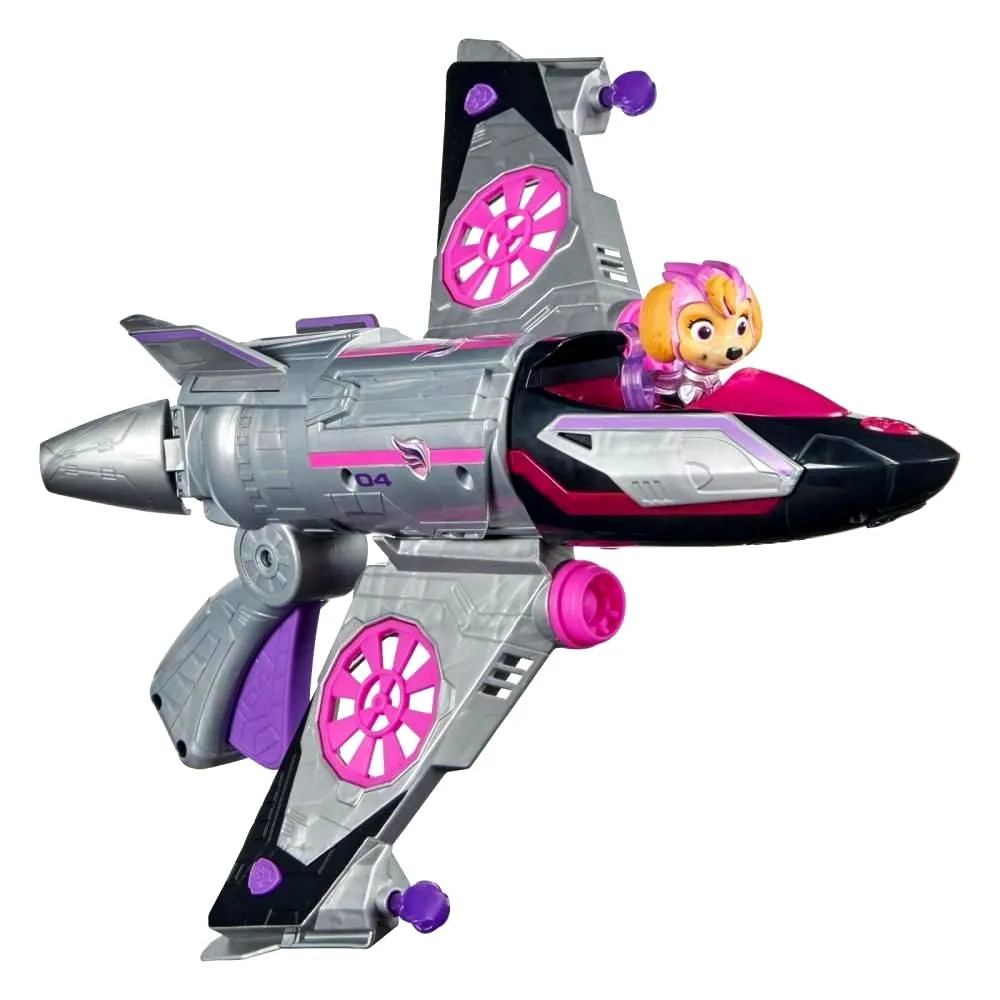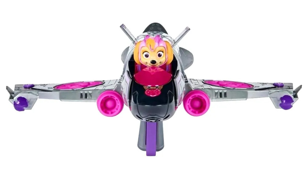 Csatold be Skye-t a játékrepülőgép pilótafülkéjébe, mozgasd körbe, és nyomd meg az emelőkart, hogy elforgasd a sugárhajtású repülőgépe szárnyait, és hogy hallhasd a mozifilm hanghatásait és zenéjét!