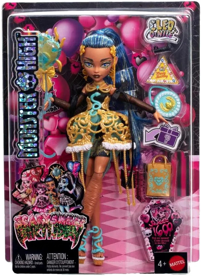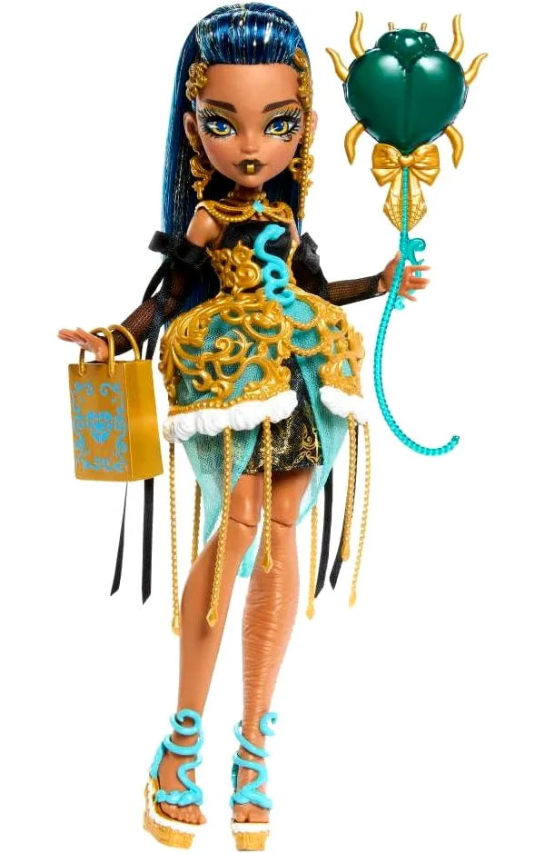 A baba mellé több apró kiegészítő is jár, például egy stílusos kézitáska és egy lufis parti kellék, amelyek még inkább életre keltik a bulis hangulatot. Cleo egyedi frizurája, hosszú, sötétkék tincsei és részletgazdag sminkje teszik igazán különlegessé ezt a játékszettet. A szett nemcsak játékra, hanem gyűjtésre is tökéletes választás, hiszen minden apró részletben ott rejlik a Monster High világ varázsa.