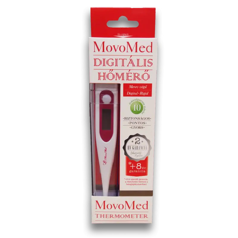 A MovoMed Digitális Hőmérő gyors és pontos mérést biztosít merev végének köszönhetően. Használata egyszerű, egy gombnyomással működik, és háromféle mérési módot támogat: orális, hónalj és rektális. A mérési eredményt 10 másodpercen belül megkapjuk, amelyet hangjelzés kísér. A készülék 10 év garanciával rendelkezik, ami egyedülálló az EU piacon, valamint rugalmas és egyszerű cseregaranciát kínál.