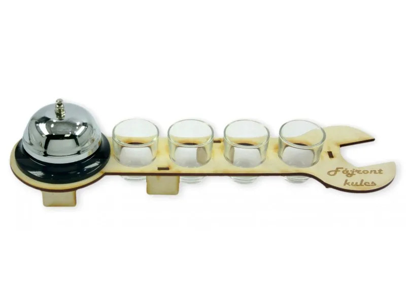Pálinkás pohár szett csengővel fa fájront kulcs formában