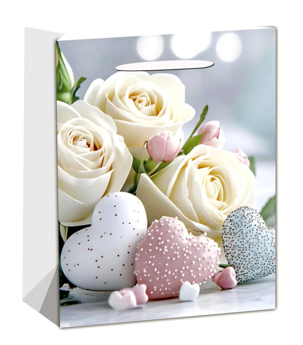 Papírtasak, fehér rózsa szívekkel, 11 x 14 cm