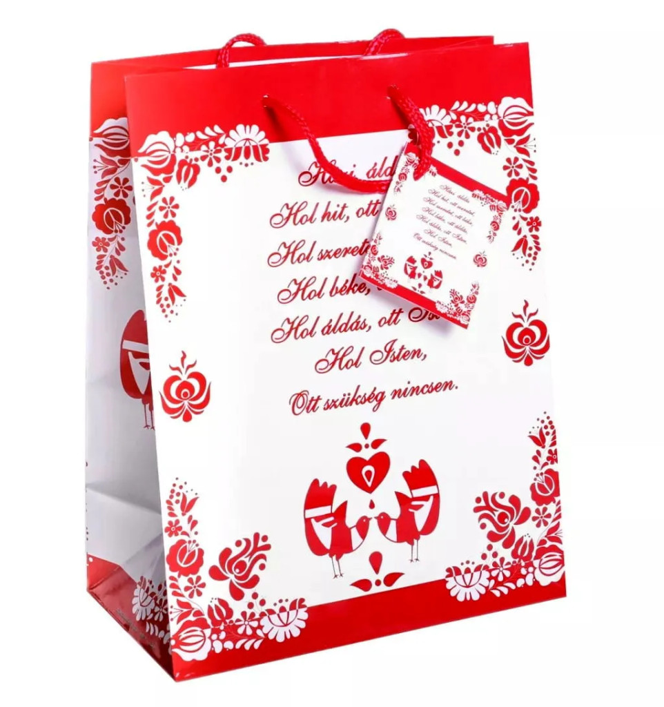 Adj különleges és meghitt hangulatot ajándékozásodnak ezzel a 18 x 23 cm-es, házi áldás felirattal díszített papírtáskával. A táska piros-fehér színvilága és a tradicionális népi motívumok harmonikus összhangot teremtenek, amely nemcsak esztétikus, de a szeretet és a béke üzenetét is közvetíti.