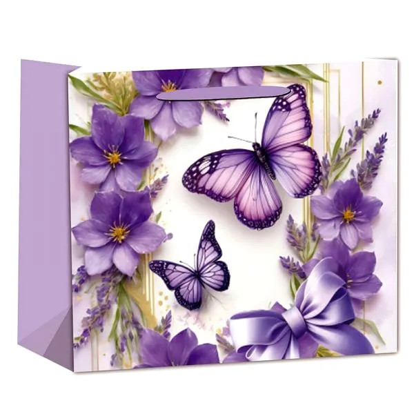 Papírtasak, lila lepke virággal, 14 x 11 cm, 40362