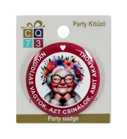 Party kitűző, Nyugdíjas vagyok feliratos, női