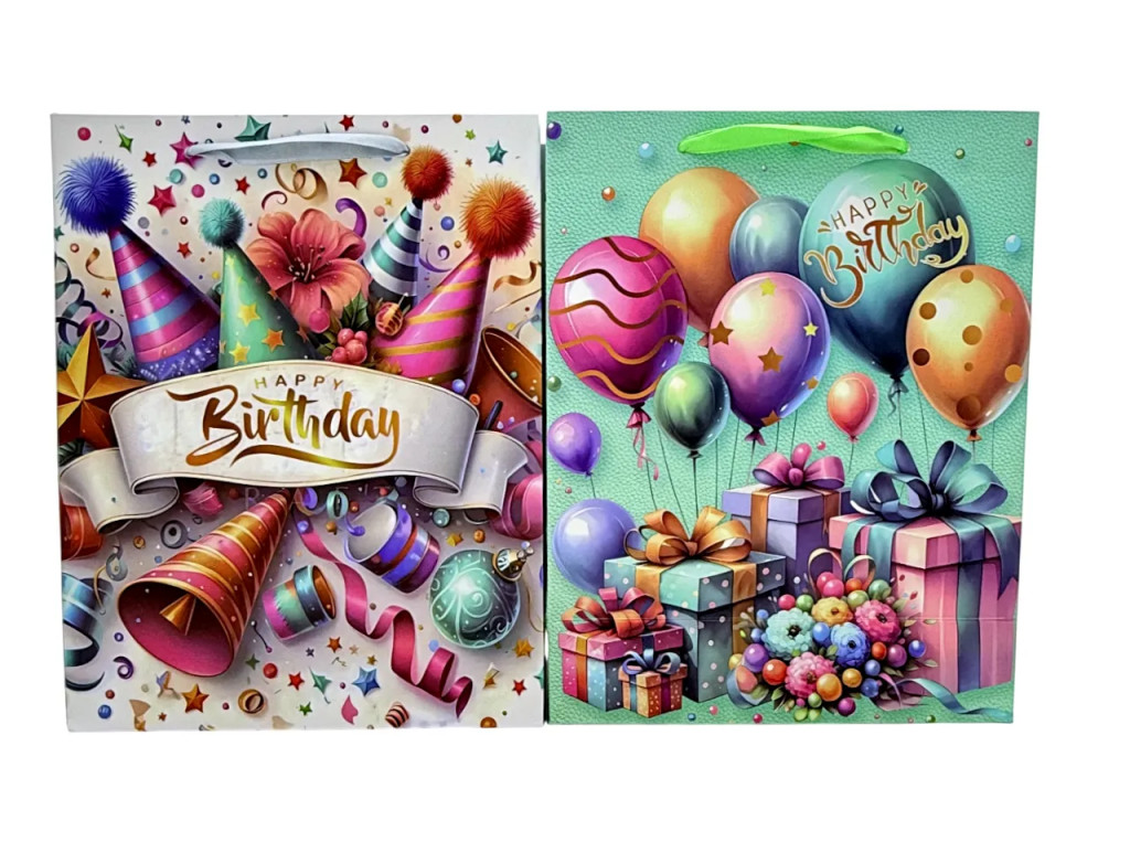 Ez a 26 x 32 x 10 cm méretű, szülinapos témájú papírtasak igazán vidám és látványos kiegészítője minden születésnapi meglepetésnek, hiszen a színes lufik, torták, ajándékdobozok és ünnepi motívumok már első pillantásra igazi bulihangulatot teremtenek. A részletgazdag, élénk minták garantáltan felkeltik a figyelmet, így a csomagolás önmagában is az ünneplés része lesz, nem csak egy egyszerű ajándéktasak.