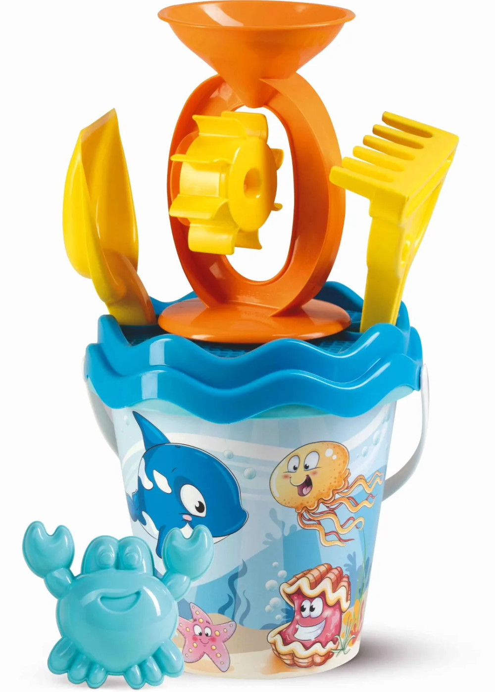 Eme játékszett középpontjában egy tengeri állatokkal díszített vödör áll, amely már önmagában is kiváló inspirációt nyújt a kreatív játékhoz. De itt még korántsem ér véget a szórakozás!