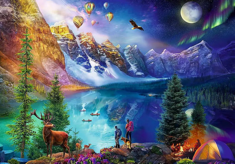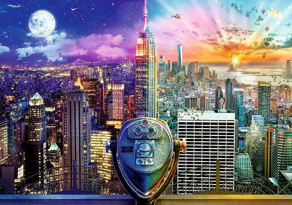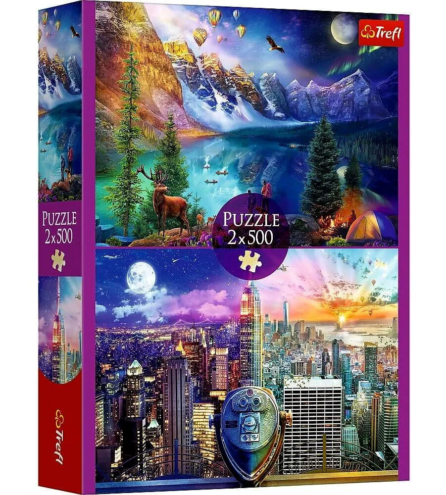 Az Amerikai körút 2 x 500 darabos puzzle különleges utazásra hív, hogy felfedezd Észak-Amerika két ikonikus helyszínét: a vadregényes természetet és a nyüzsgő nagyvárosi látképet. A szett két különböző, 500 darabos kirakót tartalmaz, így kétszer annyi élményt nyújt. Az egyik puzzle a természet csodáit ábrázolja egy lenyűgöző tavaszi vagy nyári tájon, ahol magas hegyek, kristálytiszta tavak és erdei állatok, mint például szarvasok jelennek meg. A képen még hőlégballonok is színesítik az eget, ami igazán festői hangulatot kölcsönöz. A másik puzzle New York város éjjel-nappali látképét mutatja be: a metropolisz felhőkarcolói, a lenyűgöző fények és a híres látcsővel ellátott kilátópont elevenednek meg rajta. A kép egyik fele holdfényben, míg a másik egy látványos naplementében tündököl, így a kirakós valódi vizuális élményt nyújt.
