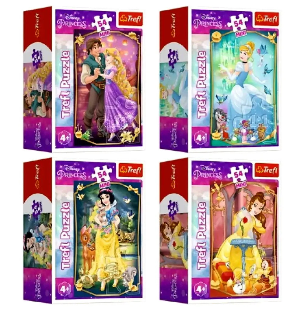 Ezeken a csodaszép mini puzzle-ökön a legnépszerűbb Disney Hercegnők láthatóak, nevezetesen Aranyhaj, Belle, Hamupipőke vagy Hófehérke. A Trefl kimagasló minőségű puzzle-jei gyönyörű, színpompás és éles nyomtatásuknak köszönhetően rendkívül részletgazdagon adják vissza az általuk ábrázolt képet. Az egyes puzzle elemek pontosan, precízen illeszkednek egymáshoz és összerakva szép, homogén felületet alkotnak a képek. Az 54db-os mini puzzle még a gyerekek számára is könnyen összeállítható.