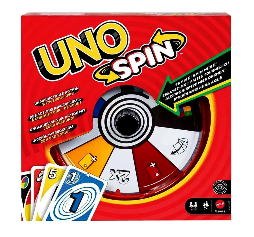Az UNO Spin a klasszikus UNO kártyajáték vadonatúj, izgalmas változata, amely garantáltan feldobja a családi és baráti összejöveteleket. A szabályok alapvetően a jól ismert UNO játékra épülnek, de egy különleges pörgető kerék teszi igazán fordulatossá a játékot. Amikor a játékos egy Spin lapot tesz le, meg kell pörgetnie a kereket, és a mutató által jelzett akciót végre kell hajtania. Ez lehet lapcsere, extra húzás, színválasztás vagy éppen valami egészen váratlan fordulat, ami teljesen megváltoztatja a játék menetét.