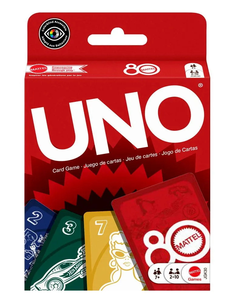 A jubileumi kártyacsomagban az ikonikus színek és szimbólumok mellett különleges grafikák díszítik a lapokat, amelyek a Mattel történetének legismertebb játékaira utalnak vissza. Így a játék közben nemcsak az UNO megszokott fordulatai és váratlan pillanatai okoznak izgalmat, hanem a nosztalgikus élmény is, amely a legendás játékgyártó múltját idézi fel.