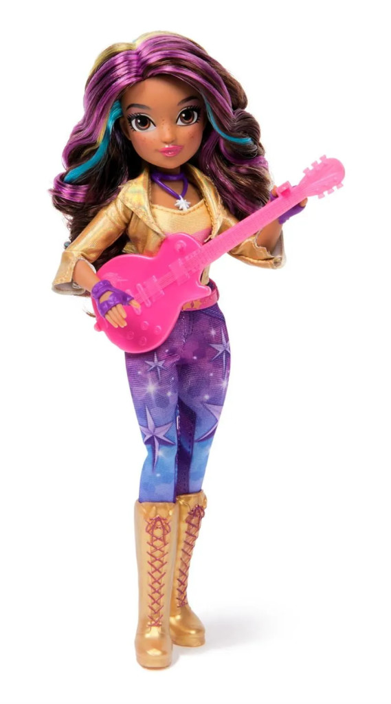 Sophia gyönyörű, hullámos hajában lila és kék tincsek csillognak, amelyek tökéletesen illenek arany kabátjához és csillagmintás nadrágjához. A csomagban egy rózsaszín gitár is található, amellyel a gyerekek eljátszhatják kedvenc jeleneteiket vagy saját zenei kalandokat alkothatnak. Az arany csizma és a részletgazdag kiegészítők még különlegesebbé teszik a babát, így minden pillanat igazi élménnyé válik vele.