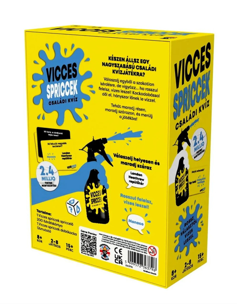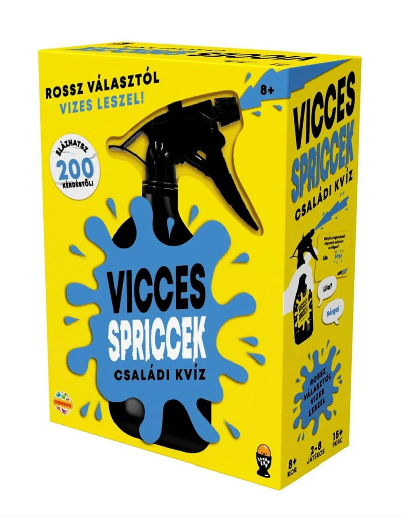 Készen állsz egy igazi nevetős és vizes mókára? A Vicces Spriccek családi kvíz társasjáték garantáltan feldobja az estéket, hiszen itt nem elég okosnak lenni, hanem gyorsnak is! A játék során 200 izgalmas és néha teljesen meghökkentő kérdés vár rád, de vigyázz: ha rosszul válaszolsz, jön a vízfröccs! A mellékelt spriccelő pisztollyal azonnal megkapja a válaszadó a büntetést, így minden forduló garantáltan kacagással végződik.