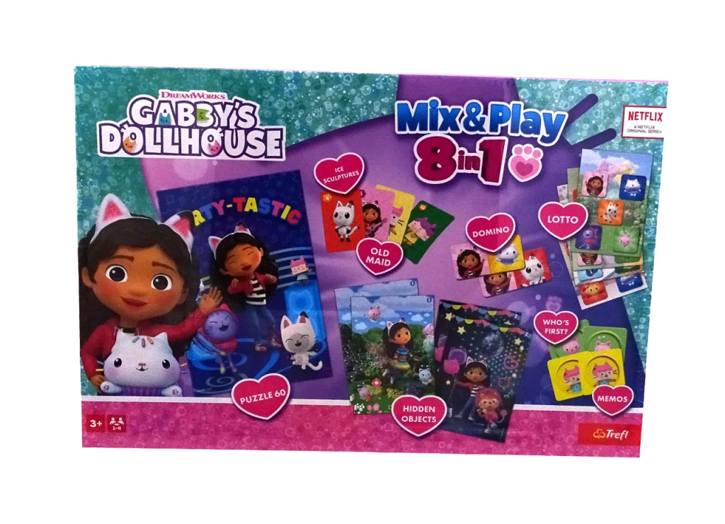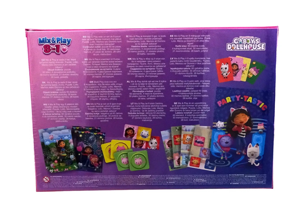 A Gabi babaháza témájú 8 az 1-ben Mix & Play társasjáték gyűjtemény tökéletes választás minden kis rajongónak, akik szeretnek játszani és felfedezni. Ez a készlet nyolc izgalmas játékot tartalmaz, köztük puzzlet, lottót, memóriakártyákat és dominót, így mindig akad új kihívás és szórakozás a család vagy a barátok számára. A játékok célja nemcsak a kikapcsolódás, hanem a logikai készségek és a memorizálás fejlesztése is, mindezt a népszerű mese vidám karaktereivel.