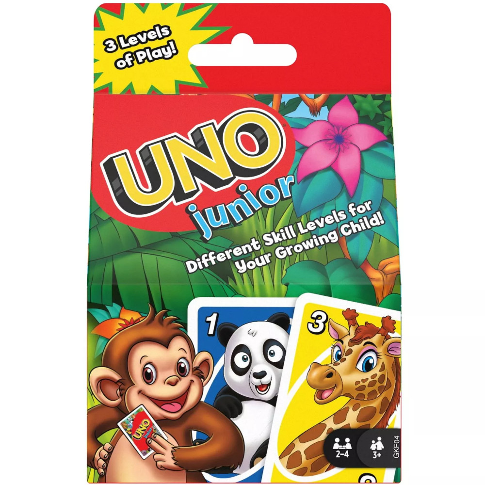 Ez az egyszerűsített UNO® játék 3 különböző változatban játszható, így mindig alkalmazkodhatunk a legfiatalabb játékos életkorához, ráadásul a játék együtt fejlődik a gyerekekkel. A lapok az UNO® ikonikus színes hátterei mellett vadállatok képét is tartalmazzák, ami megkönnyíti a párosítást a 3-4 éves korosztálynak.