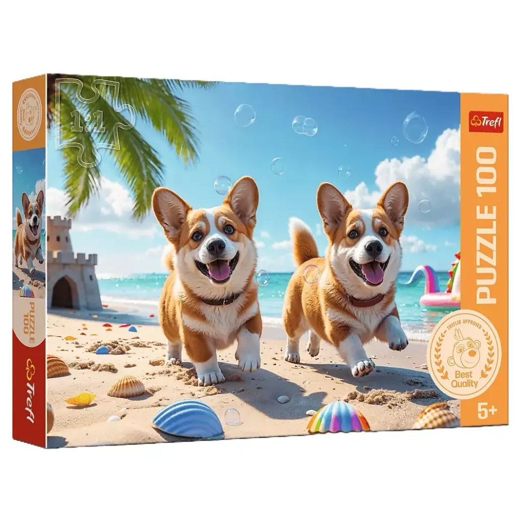Valami igazán vidám és szívmelengető élményre vágysz? A Trefl „Corgi kutyák” 100 darabos puzzle pontosan ezt nyújtja. A kirakó egy napsütéses tengerparti jelenetet ábrázol, ahol két boldog corgi kölyök szaladgál a homokban, kagylók és buborékok között, háttérben pálmafákkal és homokvárakkal. A kép egyszerre kedves, játékos és színes, így tökéletes választás minden kutyabarát számára.