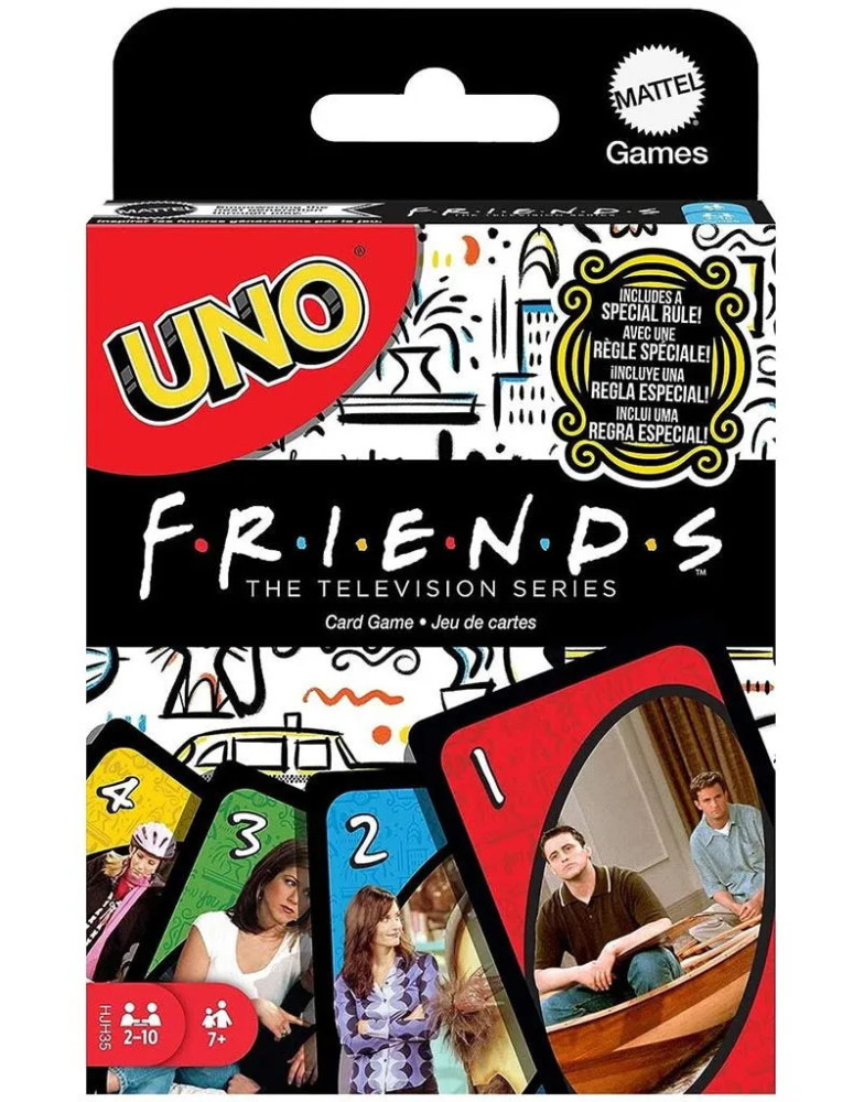 Fedezd fel az UNO Friends játékot, a klasszikus UNO kártyajáték egy különleges változatát, melyet a népszerű "Jóbarátok" televíziós sorozat ihletett! Ez a Mattel által készített játék nem csak az UNO megszokott szórakozását nyújtja, de egyedi, a sorozatból vett képekkel és idézetekkel egészíti ki az élményt. A csomag tartalmaz egy különleges szabályt is, amely a "Jóbarátok" rajongóinak kínál még több mókát és nevetést a játék során.