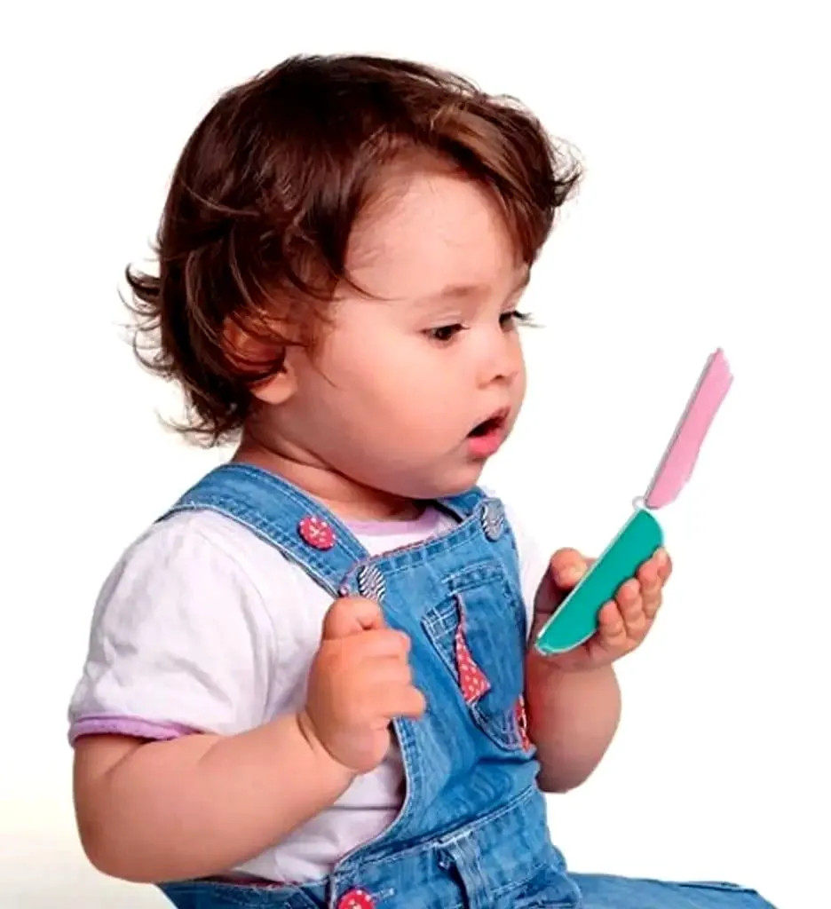 A telefon négy nagy, vidám színű gombot tartalmaz, amelyek különböző hangokat, dallamokat és fényhatásokat aktiválnak, így serkentve a kicsik hallását, figyelmét és mozgáskoordinációját. A kijelző helyén egy kis tükör kapott helyet, amely ösztönzi az önismeret fejlődését, miközben a gyerekek saját arcukat fedezik fel játék közben.