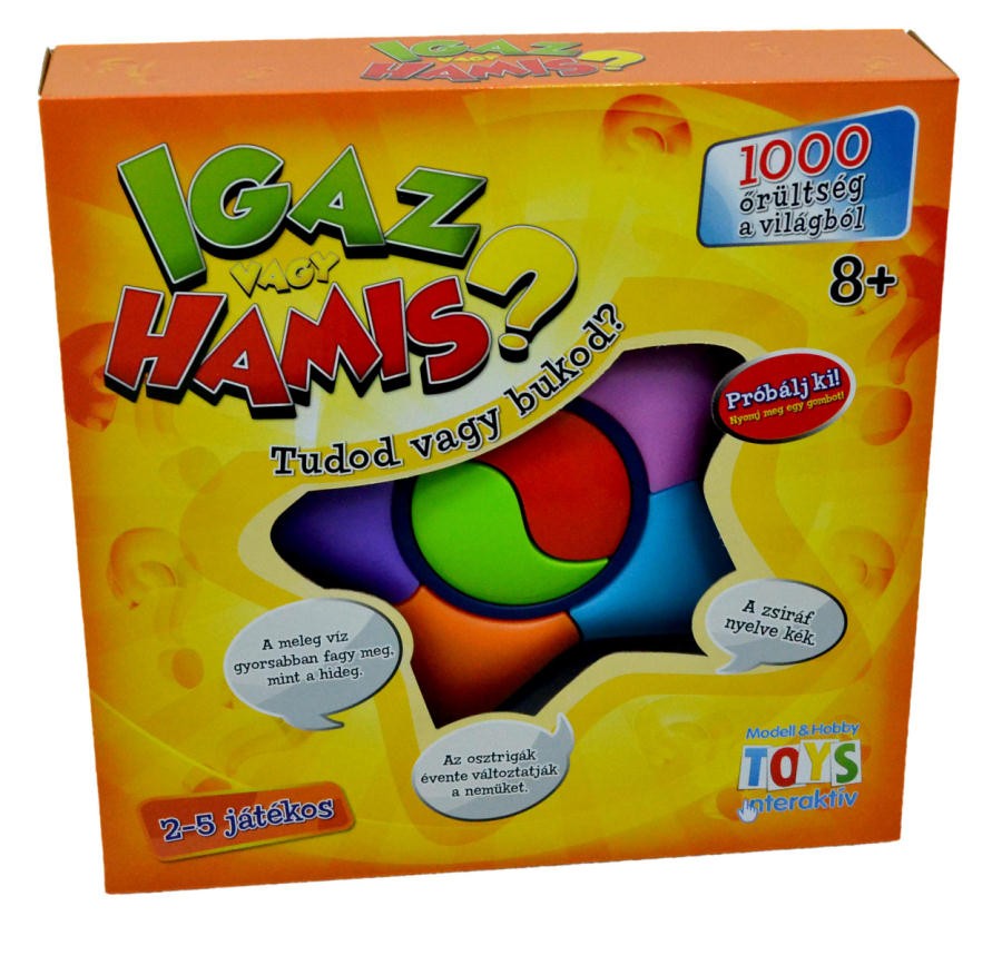 Igaz vagy Hamis? Te mindent elhiszel? Egy társasjáték nem csak gyerekeknek! Most résztvehetsz egy különleges társasjátékban és átélheted a kvíz show-k izgalmát válaszadás közben. Az Igaz vagy hamis? interaktív társasjáték felnőttek körében, családban és baráti társaságban is megállja a helyét és garantáltan jót fogtok szórakozni. A több mint 1000 kérdésnek köszönhetően (köztük Magyarországra és a magyar kultúrára vonatkozókkal is) nem fogjátok megunni az állandó ismétlődést sem! A játék próbaelemet tartalmaz. Kiváló ajándék karácsonyra is! A legnépszerűbb játékokat megtalálod a JatekBolt.hu játék webáruházban!