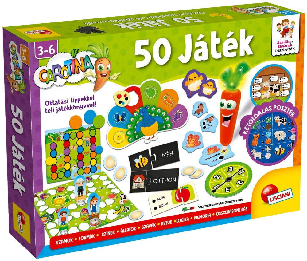 A Carotina 50 játék gyűjtemény egy fejlesztő játék csomag, amely végigvezeti a kicsiket az ábécé, az első szavak és az első számok megismerésén. Ez a játék szett nem csak egy egyszerű játékcsomag, hanem egy olyan élmény, amely segít a gyerekeknek fejlődni és tanulni.