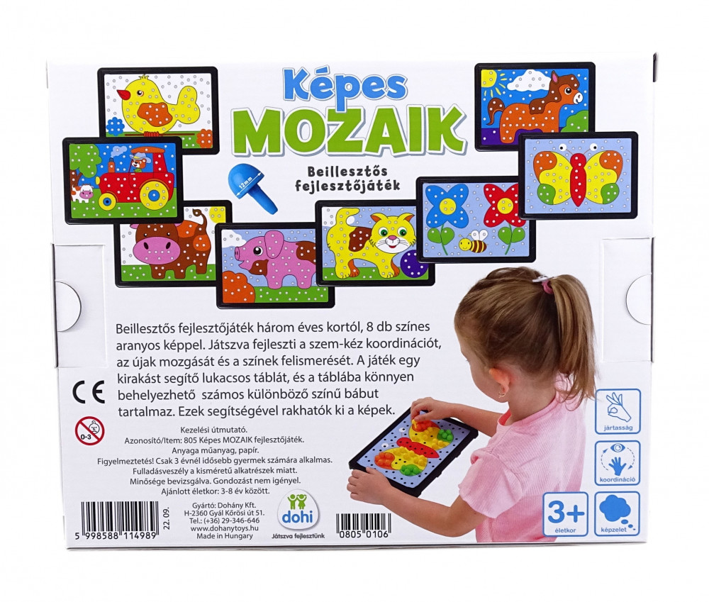 Beillesztős fejlesztőjáték három éves kortól, 8 db színes aranyos képpel. Játszva fejleszti a szem-kéz koordinációt, a finommotorikai készségeket és a színek felismerését. A játék egy kirakást segítő lukacsos táblát és a táblába könnyen behelyezhető számos különböző színű bábut tartalmaz. Ezek segítségével rakhatók ki a képek.