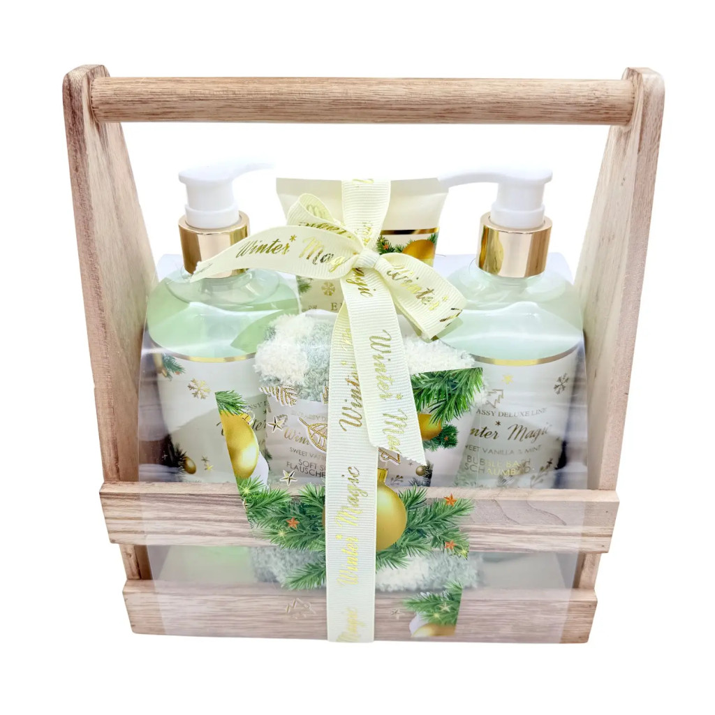 A téli hangulat legszebb pillanatait idézi ez a gyönyörűen összeállított fürdőajándék csomag, amely már első ránézésre olyan, mintha egy ünnepi spa élmény költözne a fürdőszobába. A fa hordozó nemcsak elegáns, hanem tartós és dekoratív is, így a csomag tartalma elfogyása után is hasznos kiegészítője maradhat a lakásnak. A Winter Magic illatvilág édes vaníliát és friss mentát ötvöz, amely kellemes, puha és nyugtató aromát teremt minden egyes használat során.