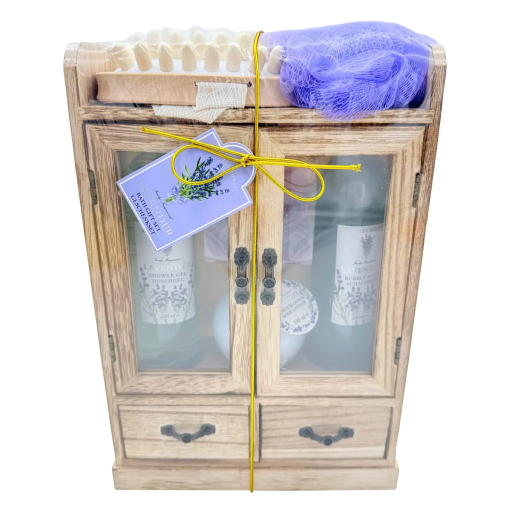 Varázslatos, levendulás hangulatot idéz ez a különleges fürdőszett, amely gyönyörű, fa hatású szekrénykében érkezik, és már első ránézésre is azt sugallja, hogy a pihenés és a kényeztetés pillanatai csak egy karnyújtásnyira vannak. A szett minden eleme a nyugodt, illatos fürdőzés élményét hozza el, miközben a dekoratív csomagolás nemcsak ajándéknak tökéletes, hanem a fürdőszoba elegáns dísze is lehet.