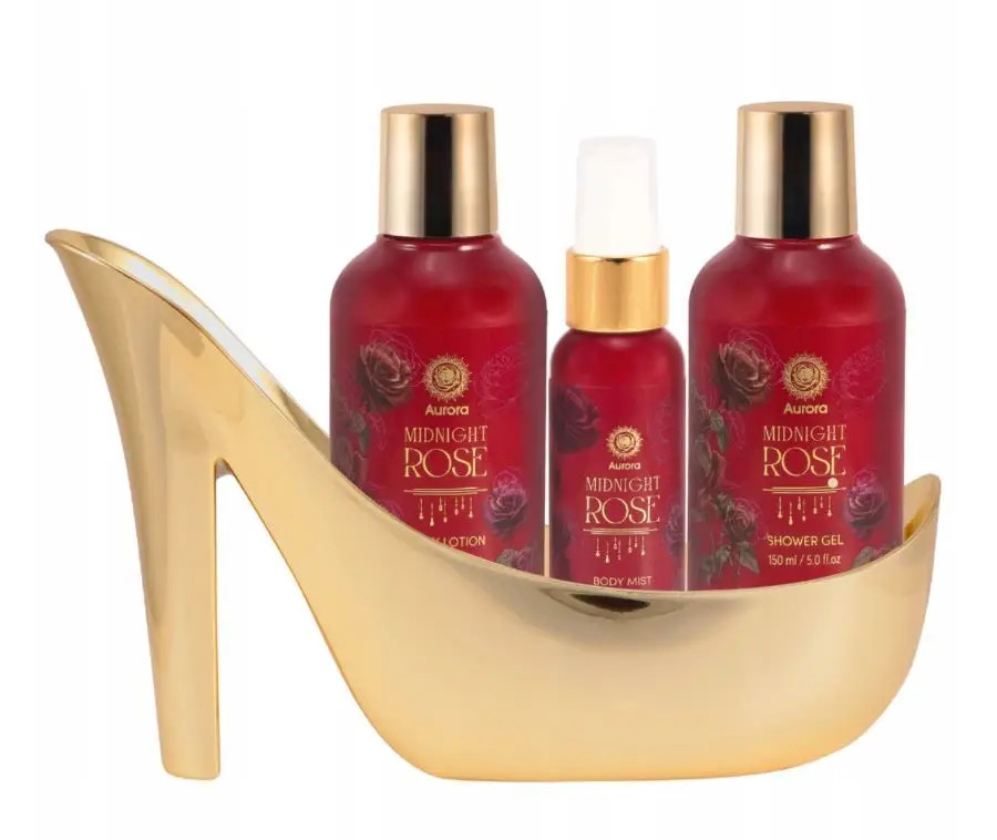 Aurora Midnight Rose luxus ajándékszett – Tusfürdő, testápoló és testpermet arany magassarkú dekorációban