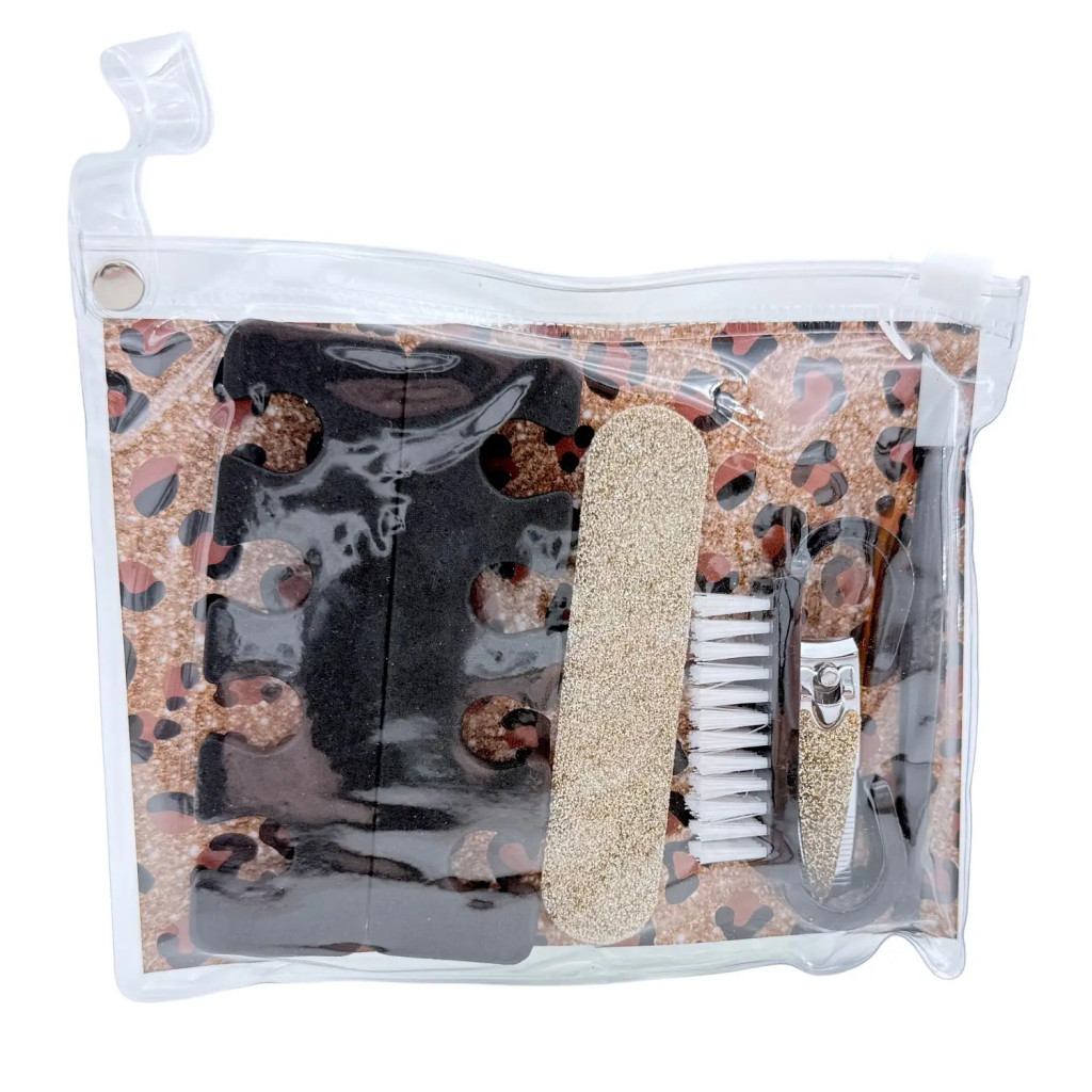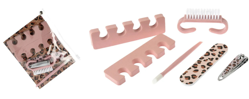 A szett dizájnja nőies és trendi, a leopárdmintás kiegészítők vidám, stílusos megjelenést kölcsönöznek a pedikűrözésnek. A kompakt, átlátszó tasaknak köszönhetően bárhová magaddal viheted, tökéletes utazáshoz, nyaraláshoz vagy ajándéknak is.