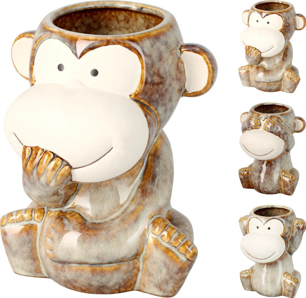 A 13 x 16 x 11 cm-es méret ideális kisebb szobanövények, pozsgások vagy dekoratív növények számára. A kaspó formája úgy lett kialakítva, hogy a növény szépen illeszkedjen a majom fején található ültetőrészbe, így a növény és a figura együtt igazán különleges látványt nyújt. A részletgazdag kidolgozás és a természetes hatású máz egyedi karaktert ad a figurának. A majom vidám arckifejezése és kedves testtartása barátságos hangulatot teremt, így jól mutat nappaliban, konyhában, irodában vagy akár gyerekszobában is.