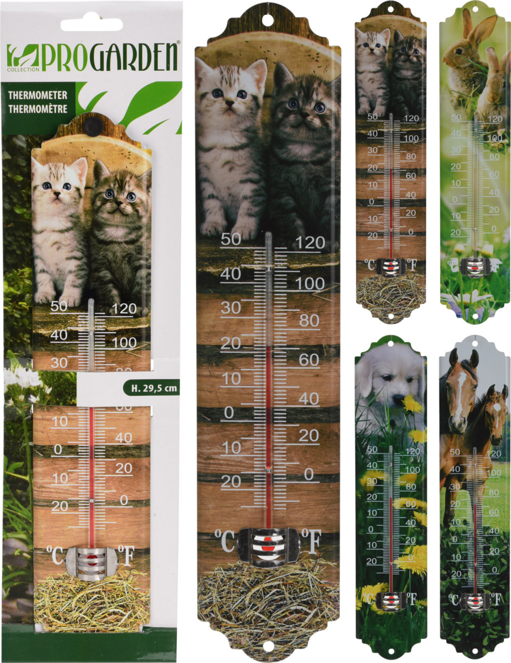 A 29 cm-es hőmérő jól látható skálával rendelkezik, amelyen a hőmérséklet Celsius és Fahrenheit fokban is könnyedén leolvasható. Ideális választás kültéri használatra, így mindig gyorsan ellenőrizhető az aktuális hőmérséklet a kertben vagy a ház körül. A hőmérő négy különböző állatos mintával érhető el, például aranyos cicás, kutyás, nyuszis vagy lovas változatban. A természetes hangulatú háttér és a részletes, színes képek igazán dekoratívvá teszik, ezért jól mutat falra vagy kerítésre rögzítve.