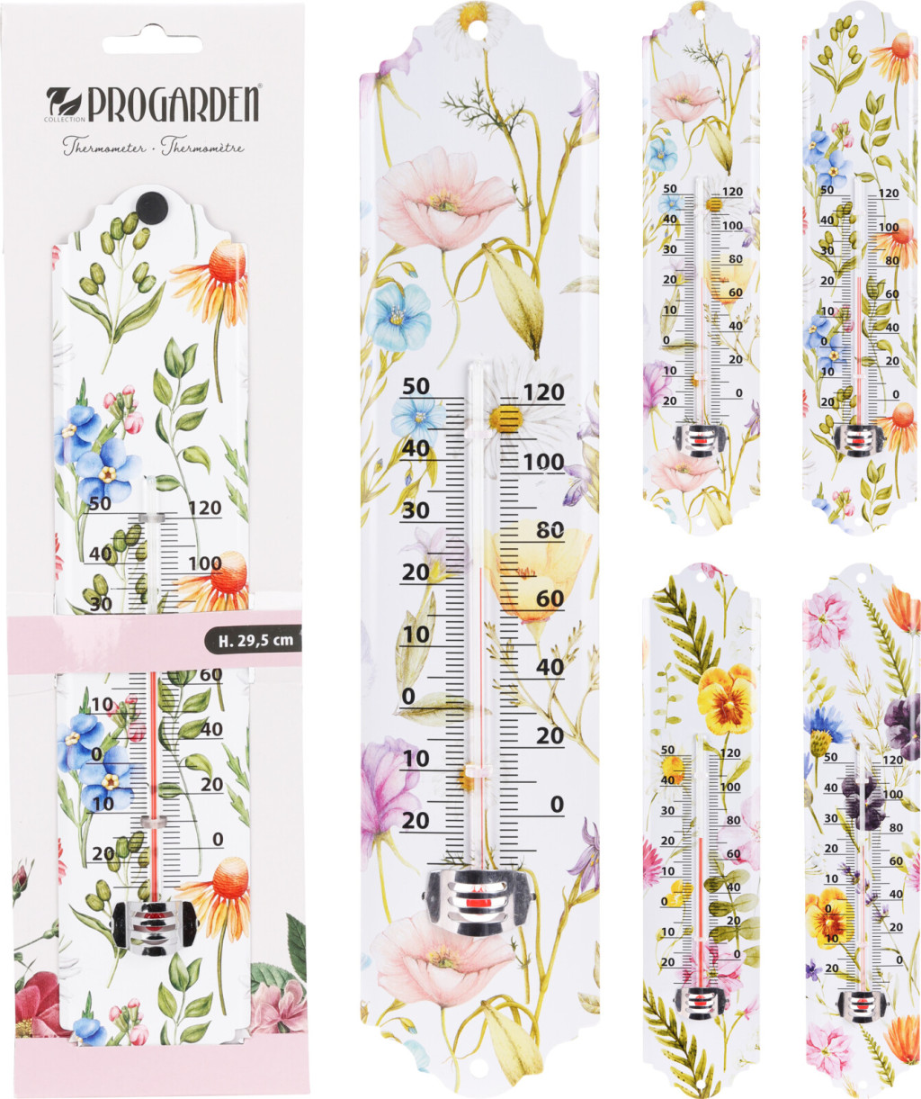 A 29 cm-es méretnek köszönhetően a skála jól látható, így a hőmérséklet gyorsan és könnyen leolvasható. A hőmérő Celsius és Fahrenheit fokban is mutatja a hőmérsékletet, így pontos tájékoztatást ad az aktuális időjárási viszonyokról. A hőmérő négy különböző virágos mintával érhető el, amelyek természetes és elegáns megjelenést kölcsönöznek neki. A finom részletekkel díszített minták különösen jól mutatnak kertben, virágágyás közelében vagy egy napos falon elhelyezve.