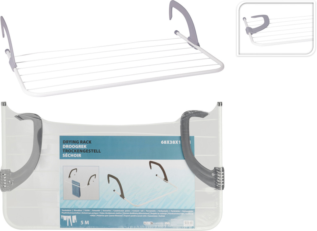 A 68 x 38 cm-es méretének köszönhetően elegendő helyet biztosít kisebb ruhadarabok, törölközők vagy fehérneműk szárításához, miközben nem foglal el értékes padlóterületet. A stabil akasztókarok könnyedén rögzíthetők különböző vastagságú korlátokra, így gyorsan és biztonságosan használatba vehető.