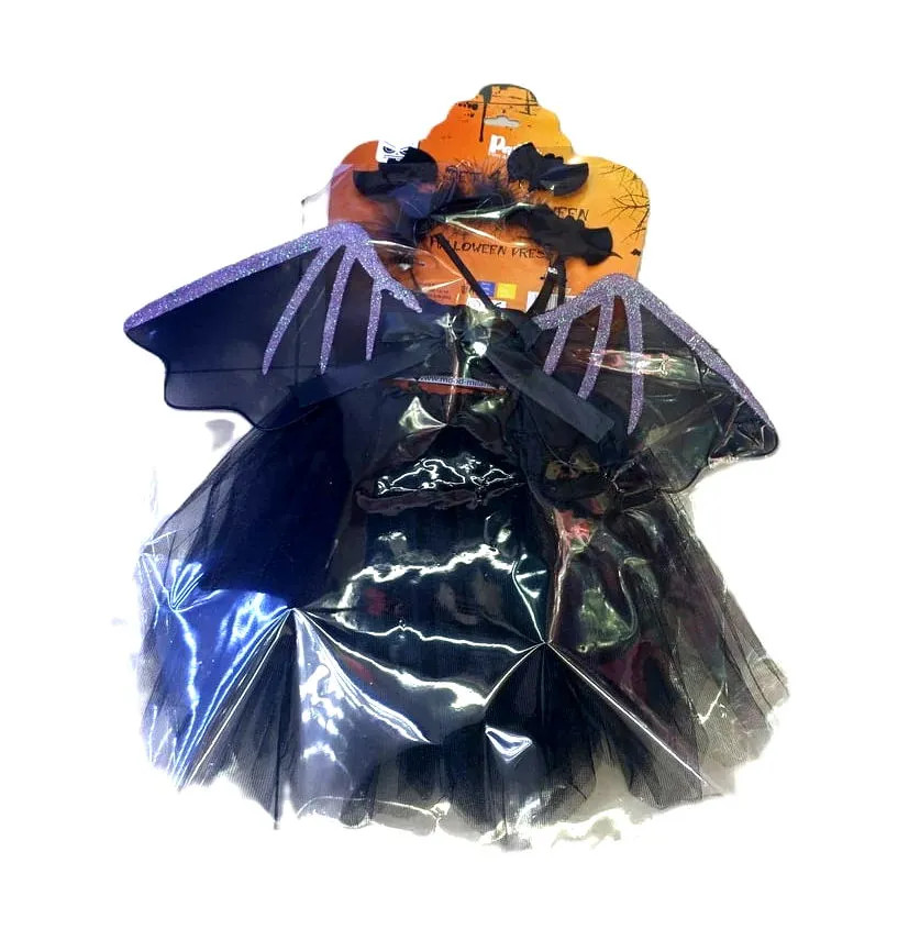 Engedd szárnyalni a képzeletet ezzel a varázslatos denevér jelmez szettel! A fekete tüllszoknya és a csillogó, lila szárnyak tökéletes kombinációja egyedi, sötét, mégis mesés megjelenést kölcsönöz. A szett részét képező fejpánt cuki denevérfülekkel teszi teljessé az összeállítást, így garantáltan mindenki a csodájára jár majd.
