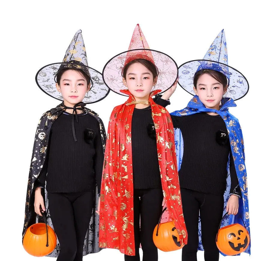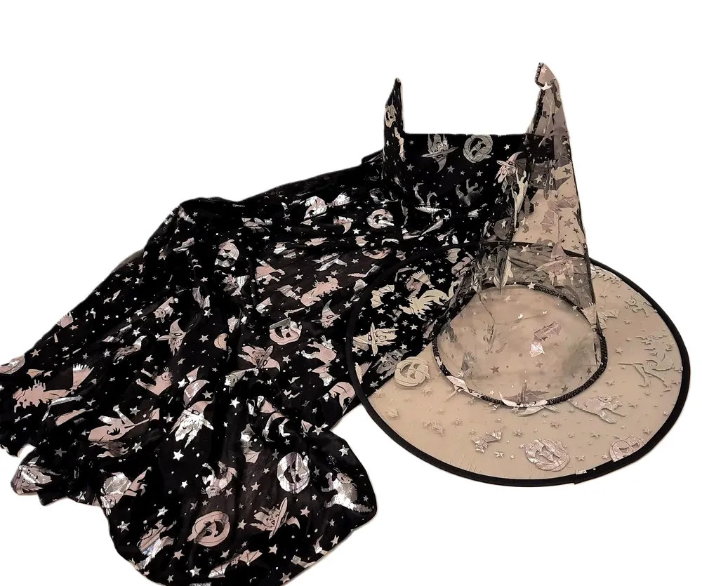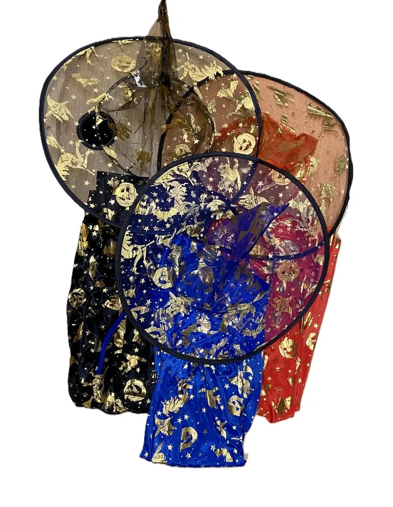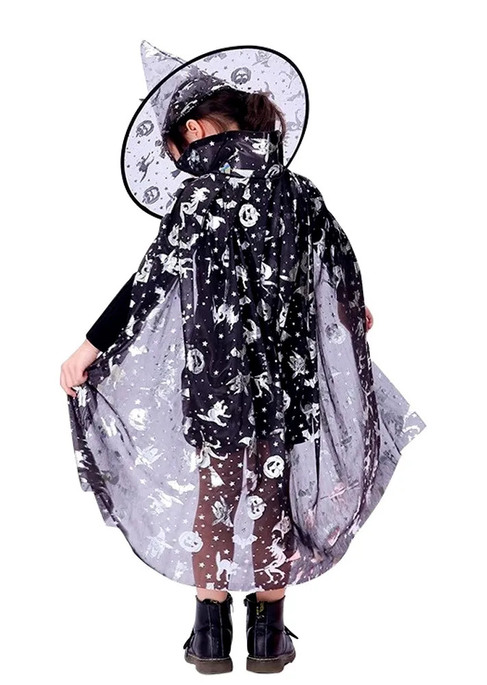 A szetthez tartozó hegyes varázslókalap tökéletesen kiegészíti a köpenyt, együtt pedig egy igazán látványos és jól felismerhető jelmezt alkotnak, amely könnyedén kombinálható egyszerű fekete ruhával vagy más jelmez kiegészítőkkel. A köpeny könnyű, kényelmes viselet, így a gyerekek szabadon mozoghatnak benne, varázsolhatnak, kalandozhatnak és beleélhetik magukat a fantáziadús történetekbe hosszabb játékidő alatt is.